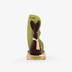 Our Easter bunny Lou has two big eyes that will melt children’s hearts and a mesmerizing look that would grace any festively decorated Easter table. Standing 15.5 centimeters tall, Lou is cast from fresh dark chocolate and carefully hand-decorated with white and dark chocolate. The graceful neck is adorned with a colorful scarf, the left ear with real silver dust. A chocolate bunny to fall in love with. (65 g)