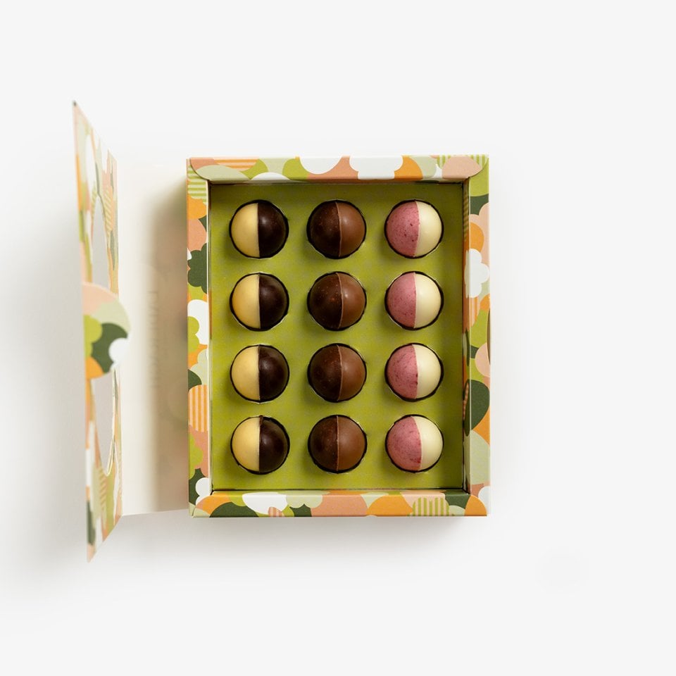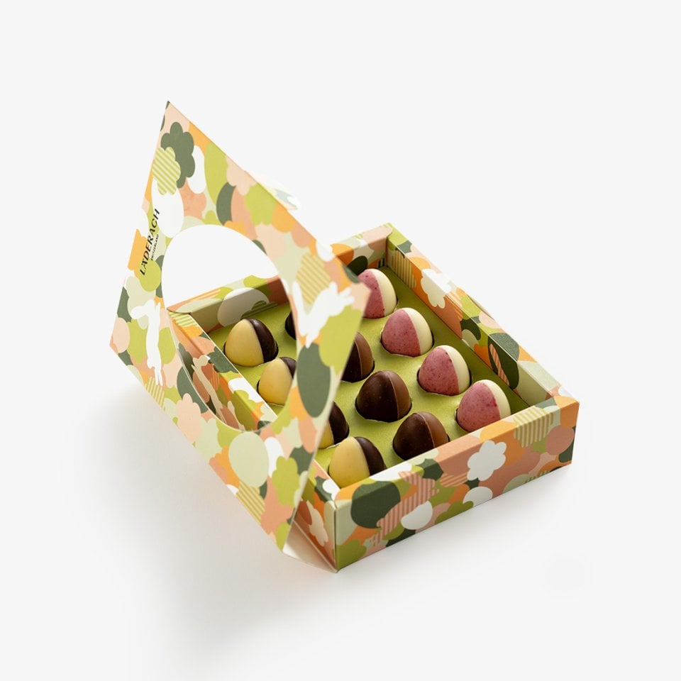 This beautifully crafted Easter pack contains three different varieties of our popular praliné duo eggs: four Mango Passion Fruit Dark duo eggs with a truffle filling made of passion fruit and 70% Single Origin Ecuador chocolate, four Gianduja Caramel duo eggs with crunchy almond and caramel pieces, and four Raspberry duo eggs made of white chocolate, mixed with real raspberries and filled with a heavenly bourbon vanilla gianduja. An Easter surprise that everyone will love. (110 g)