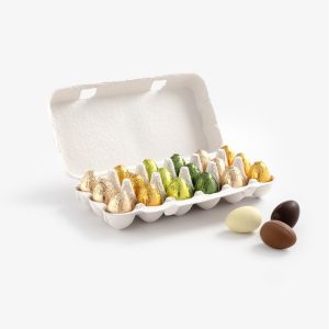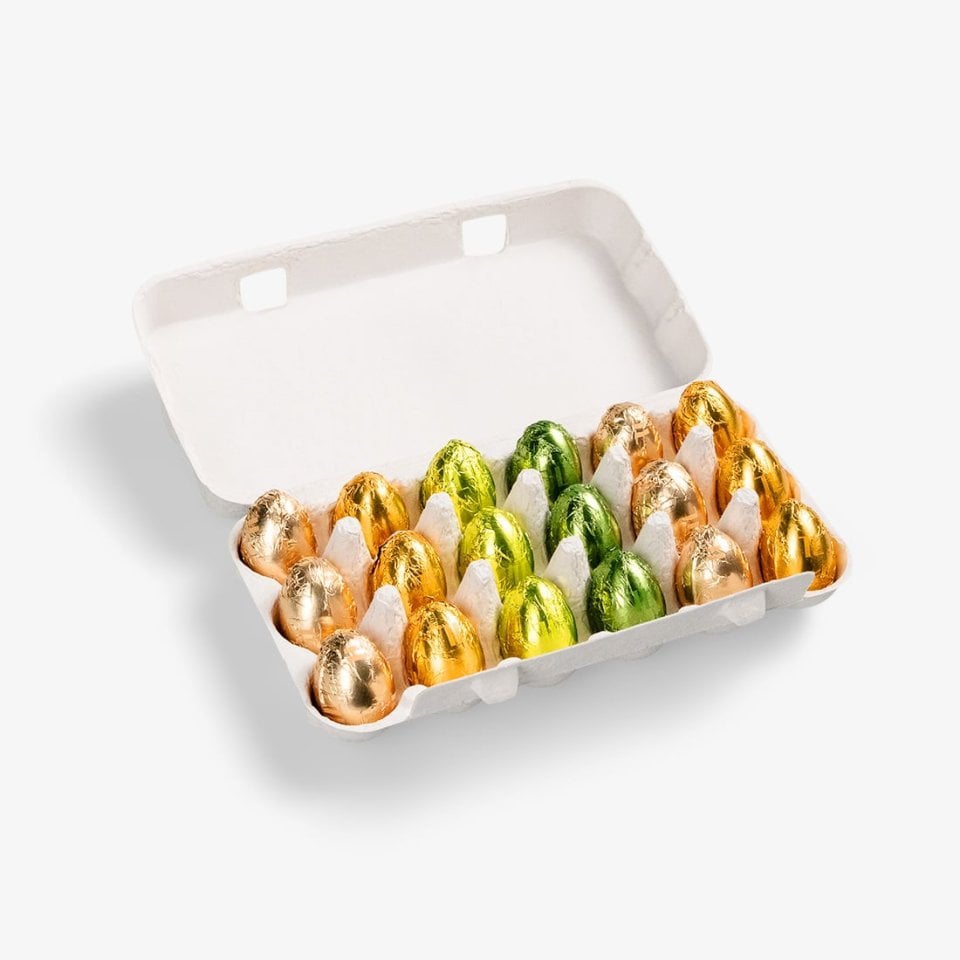 Surprise your friends with an Easter gift in original packaging. This miniature egg box contains 18 colorful Easter eggs: six praliné Milk eggs with a milk chocolate filling, six praliné Hazelnut Milk eggs with a milk chocolate and hazelnut filling, three white praliné Almond eggs with almond gianduja, and three praliné Dark eggs with a center of smooth, dark truffle. (170 g)