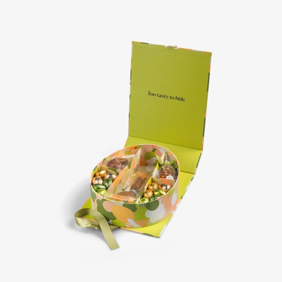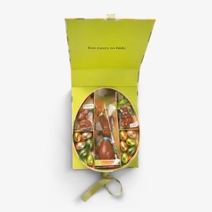 Our lavishly filled gift box is a welcome alternative to a home-made Easter basket. It contains several figures and eggs: A 15.5 cm Lou made of the finest milk chocolate, a milk bunny with a delicate hazelnut-gianduja filling, a Piedmontese bunny with whole caramelized hazelnuts, and a selection of popular praliné eggs in four different flavors. (205 g)