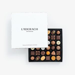 A selection of 36 exquisite pralines for an unforgettable taste experience. Thebox contains the following varieties of pralines (with and without alcohol): Honey-Nougat carré, Almond à l’ancienne, Yuzu, Almond blond, Nougatine, Truffle Dark, Truffle Champagne, Truffle Baileys, Truffle Caramel, Mousse Milk, Carré Läderach, Truffle Capuccino, Truffle Milk, Trois Frères, Pistache-Gianduja, Nut Trio, Piedmontese and Rigoletto. (425g)